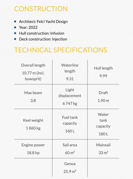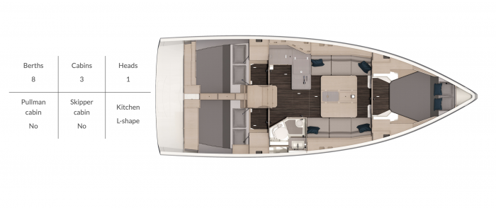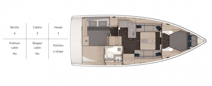 Für den Innenraum stehen Ihnen zwei Grundrisse zur Verfügung, je nachdem, wie Sie segeln möchten: In der Version mit zwei Kabinen können Sie ein sehr großes Badezimmer (und einen großen Außenstauraum) sowie zwei unabhängige Kabinen genießen, darunter die Eignersuite im Bug. Sechs Schlafplätze sind dank des Salontisches möglich, der in einen Schlafplatz umgewandelt werden kann.